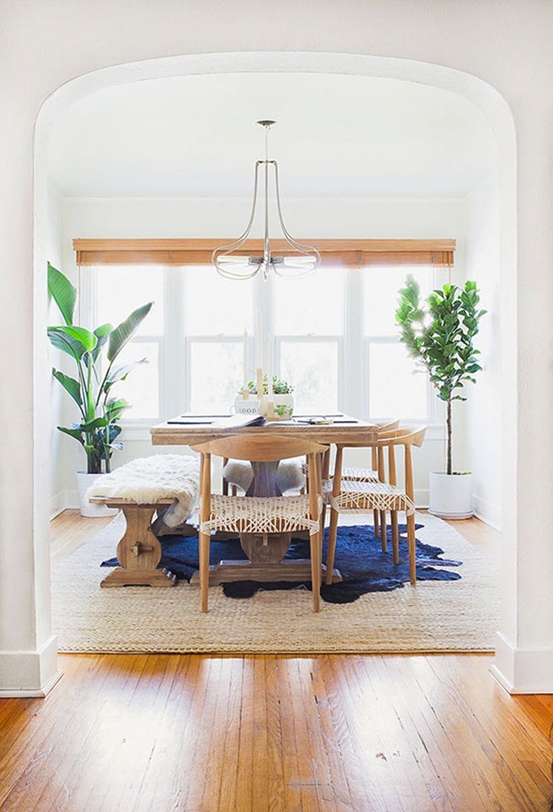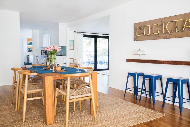 Our favorite element of a beach home is that, while chic, it's casual and embraces the beach-goer lifestyle. A dining room like this is the place where you shake out the sand, famished from a day in the sun, ready to eat. Note how well texture and color work in this room, with natural hues and jute elements blending with bold blues and teals.