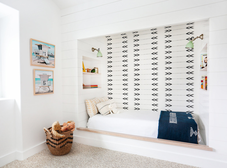 A pop of nautical inspiration here and there will keep your beach-inspired space on-brand without being aggressively thematic. We love the lighthouse photography on the wall in this boy's bedroom.