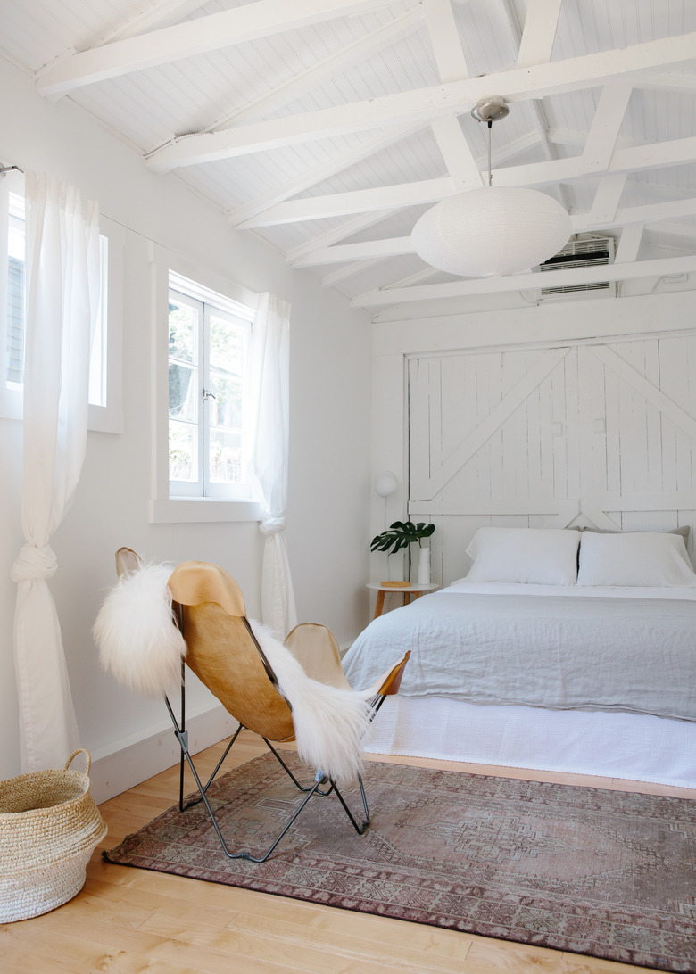 The light-filled guest house seems all the more larger thanks to a play on light and space, with a pitched, white ceiling. And believe it or not, that vintage-feeling leather chair is from Urban Outfitters.
