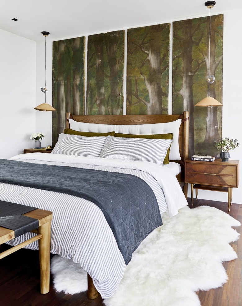 Layering is a wonderful way to add texture and warmth to your bedroom. Take the space above, for example. The hardwood flooring and off-white walls and duvet cover take on new life when paired with a patterned area rug, rich orange throw blanket and pillows, a painted headboard, and hanging greenery. These touches make the room feel cozy and inviting.