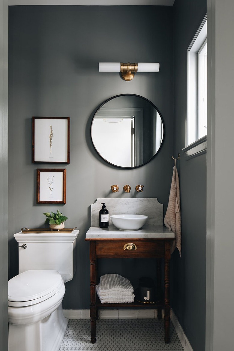 If you've gone with a slate gray shade in your bathroom, copper accents can make the space even more visually appealing. Think cabinet hardware, lighting, and shelf brackets à la this dark refuge by Karisa of Petite Modern Life.