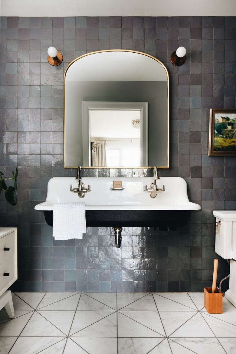 Reminiscent of a luxury hotel ensuite, this floor-to-ceiling accent wall makes a bold statement. The dark gray tiles — ranging in color from charcoal to blueish-gray — is complemented by warm brass fixtures and a trough sink, resulting in a handsome bathroom perfect for anyone looking to add a little drama to their daily routine.