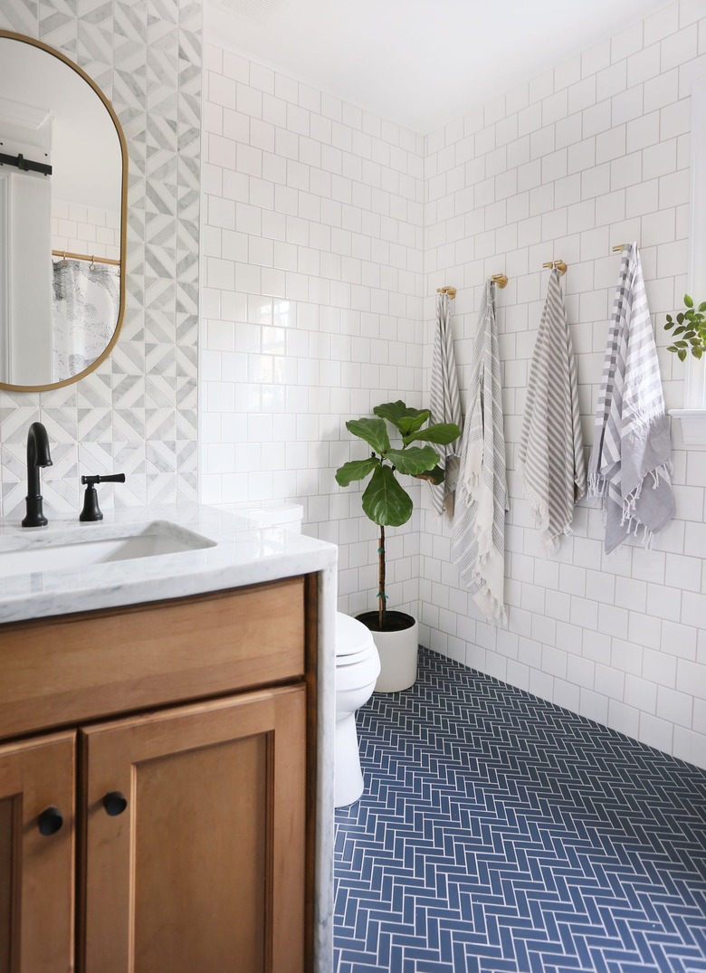 Want to inject some color into your gray color palette? Consider blue. Here, Erin of Sunny Circle Studio paired her gray and white wall tile with navy floor tile, adding a surprising burst of energy that's more than welcome in a bathroom design.
