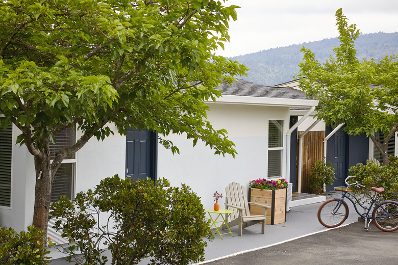 Coats of white and dusty-blue paint applied to each of the buildings are a calming welcome upon arrival and matched with vintage bicycles, Adirondack chairs, and furnishings in citrus hues (like the yellow metal café table and orange vase).
