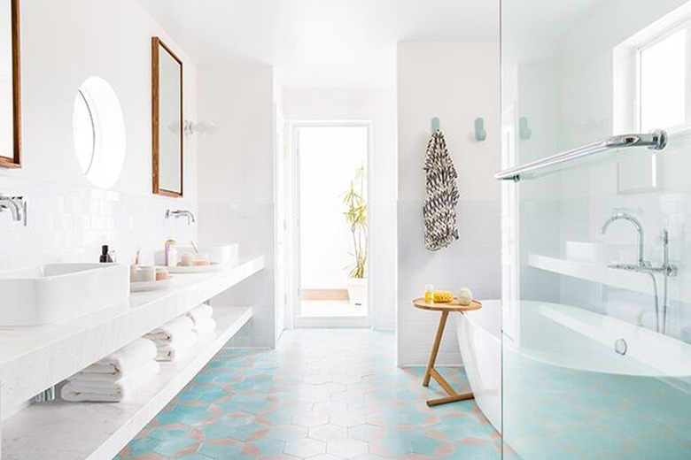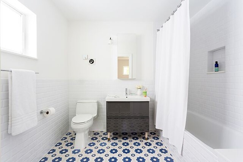 Adding white tile along the walls is a great way to balance out the beautiful design on the floor below.