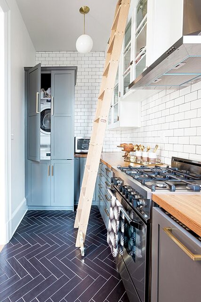 A rich navy design helps ground this petite kitchen, while white subway tile adds order to the backsplash.