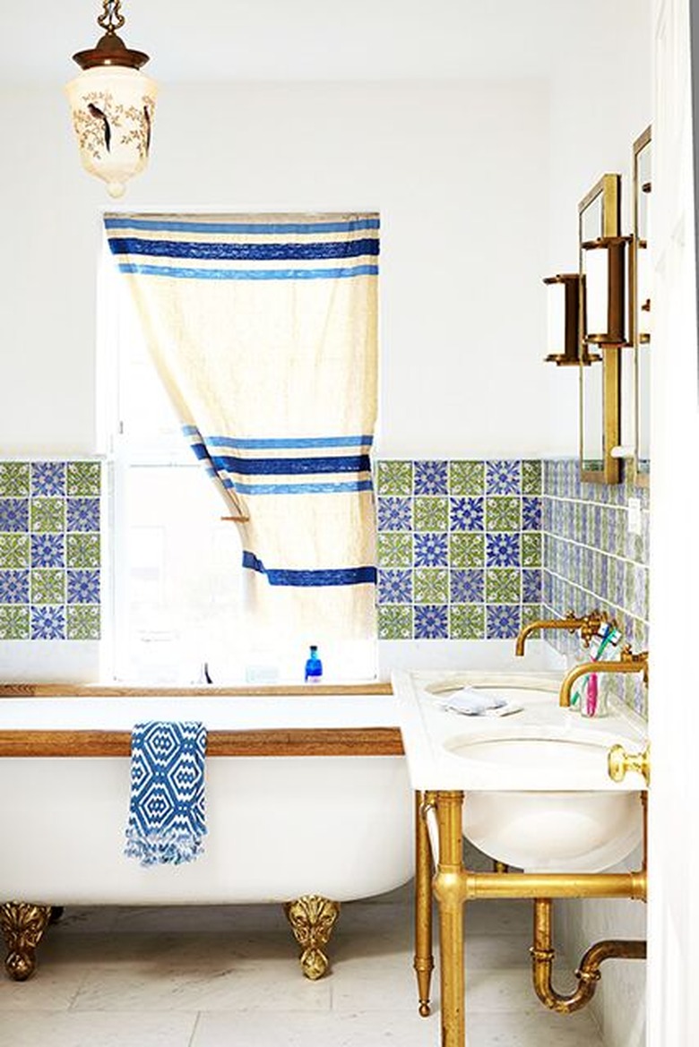 This pretty bathroom has three different tile designs throughout the space. A lovely decorative design that works well with the Persian rug, a simple grey tile on the shower floor, and a vertical shape to add direction to the walls.