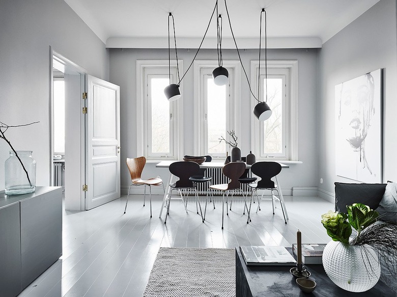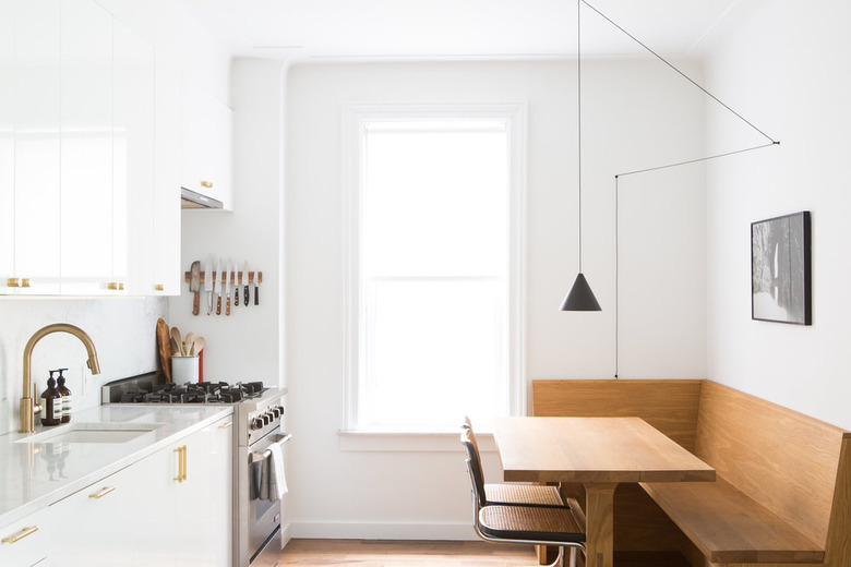 This suspension light fixture by Flos is gorgeous proof that lighting has the power to completely transform a room. In a visual display of acrobatics, this matte-black, conical string pendant takes this tiny kitchen from drab to fab.