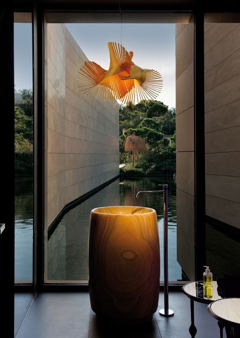 The epitome of modern elegance, this sculptural suspension light adds a dynamic sense of drama to a stunning bathroom. The suspended strips of wood veneer cast ambient light filled with intriguing shadows, while providing direct down light where you need it most.