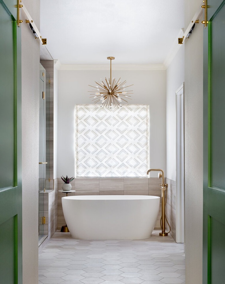 You can't think of midcentury modern design without conjuring images of the iconic atomic starburst. Due to its popularity, it didn't take long before lighting designers began adopting this asymmetrical shape for flush mounts, chandeliers, and pendant lights. Meredith Owen Interiors showcased the eye-catching ceiling fixture above the freestanding tub in this elegant bathroom design for a little retro glam.