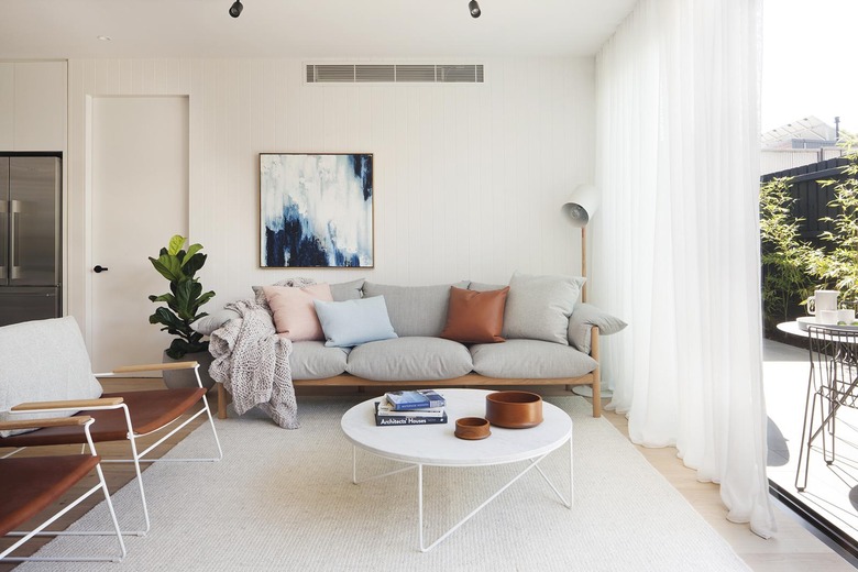 A Dulux Natural White on the walls sets a minimalist backdrop that continues with an A&Co. rug and Wilfred Sofa by Jardan. Pops of white are a theme in the room, appearing on the lamp, side chairs, and coffee table.