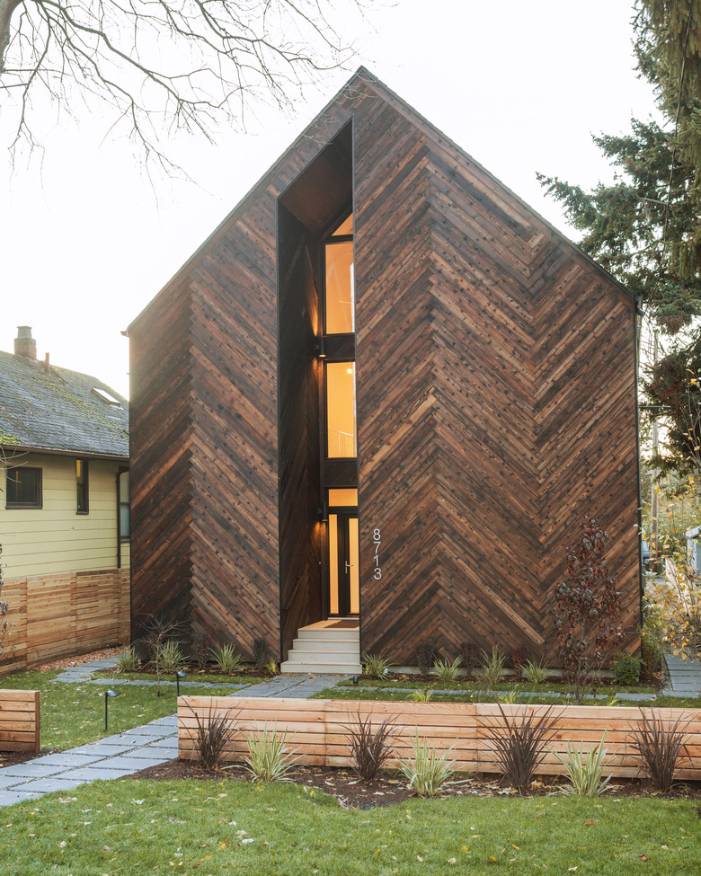 When a 69-year-old retiree decided to build a new home in a neighborhood north of Seattle, he wanted a place that was reminded him of his past but with features that looked toward the future. Architects Tiffany Bowie and Joe Malboeuf of Malboeuf Bowie Architecture worked with the owner to design a home that met passive house certification standards, a complex process that ensures extreme energy efficiency. Inspired by Scandinavian design, the architects focused on incorporating simple forms and plenty of open spaces. The façade is clad in hand-charred cedar in a herringbone pattern. The wood's shou sugi ban treatment is a nod to the owner's travels and work in Japan and also helps protect the material from the rainy climate.