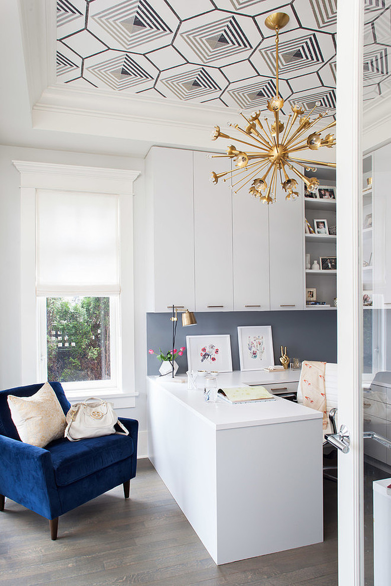 With a little out-of-the-box thinking, this ceiling takes a would-be ordinary office space and transforms it into a truly jaw-dropping design. The white walls are the perfect backdrop for this swanky geometric wallpaper. Get the look with a similar pattern by David Hicks.