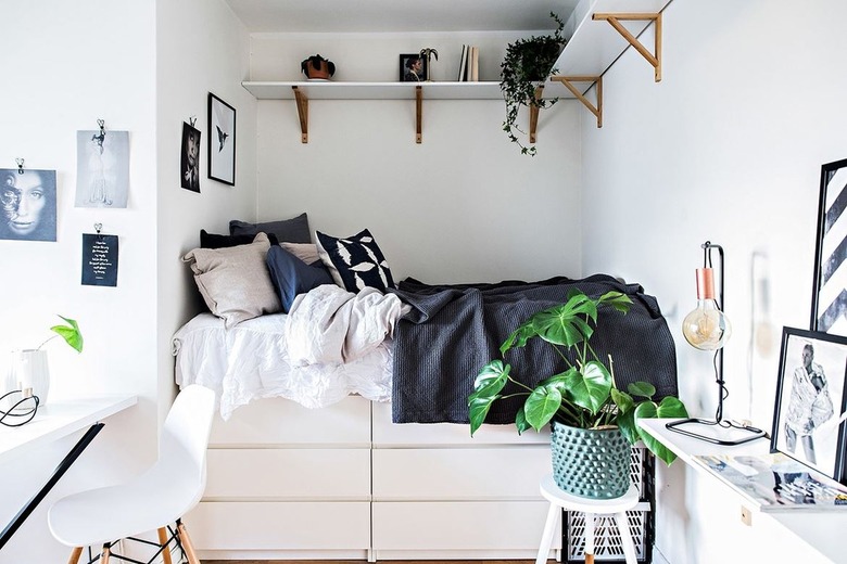 For some, loft-style beds conjure childhood memories of summer camp or freshman year of college. However, cramped city living has seen a resurgence in the adolescent bunk, so don't knock it until you've tried it. Not only is this sleeping arrangement fun (you get to literally climb into bed every night!), but opting for the lofty design allows you to utilize the space below for more important things than dust bunnies. If you're working with ultra-limited square footage, opening up that floor space is invaluable. You could fit one (or two) full-size dressers under there, as proven by this petite setup spotted on Bjurfors.