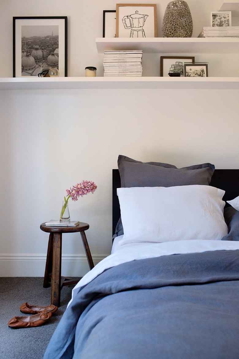 Under-the-bed storage is key to living with a small bedroom, but don't stop there. All of your wall space can be used for storage, too — this time for the items you actually want to show off. Take a cue from the cozy sleeping quarters above that we spotted on Bjurfors. Here, shelving was added above the dresser to display everyday items that are used regularly. And how sweet is that step stool?