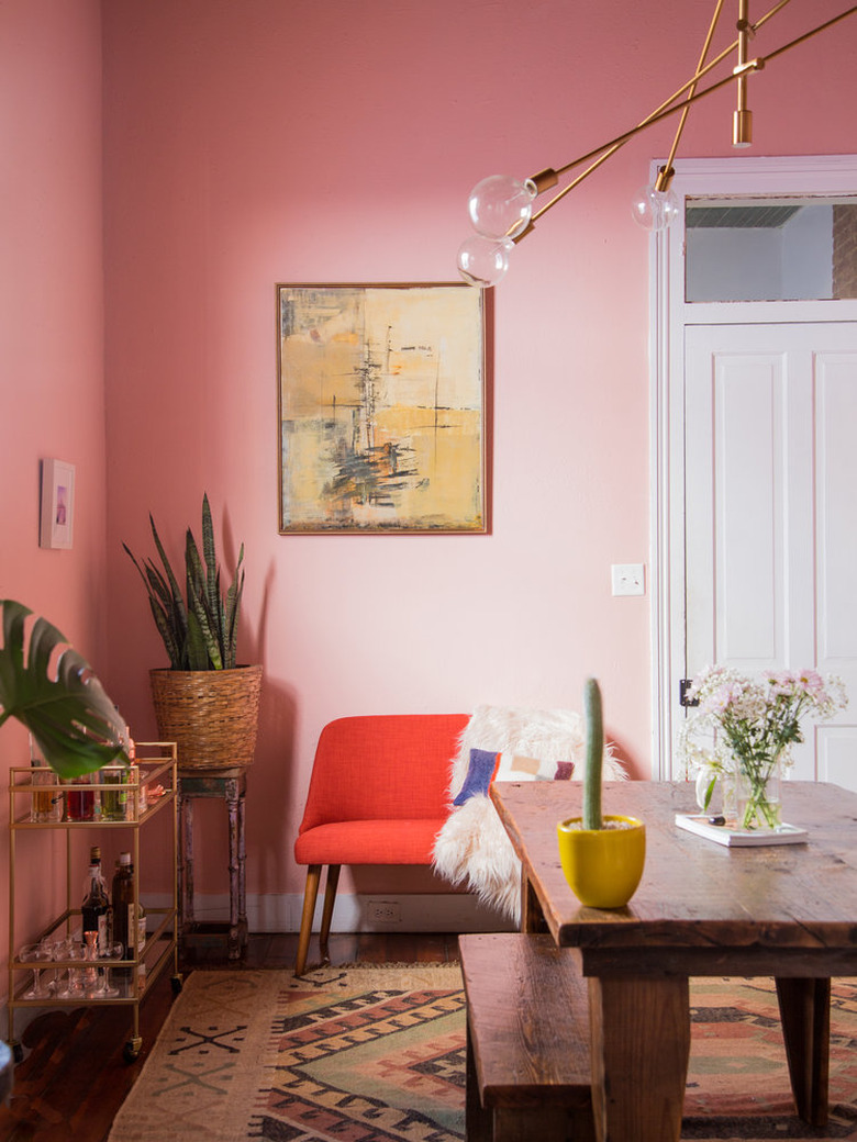 Pink reigns supreme in this living room, and that's okay. Go all out with pink, and like this sitting area, sprinkle in a hint of red with a sofa or an art print. We want to curl up in this warm and inviting room ASAP.