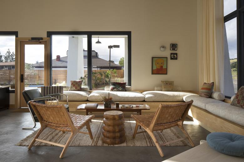 Built-in benches with cushions by Austin, Texas, design studio Yucca Stuff make a tight lobby feel cozy while large picture windows bring in natural light. Sconces by Rich Brilliant Willing (see example above the largest of the three paintings) were also added to the lobby.