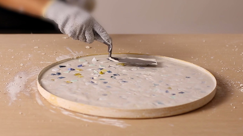 Traditionally, authentic terrazzo tabletops consist of a concrete mix of cement, sand, granite or marble chips, and strengthening nylon fibers. This special mix is poured into a custom mold fitted with a metal mesh inside for additional reinforcement. Finally, the tabletop is removed from the mold after setting and sealed with a durable epoxy resin. Not what we'd exactly call a doable DIY for the everyday crafter.