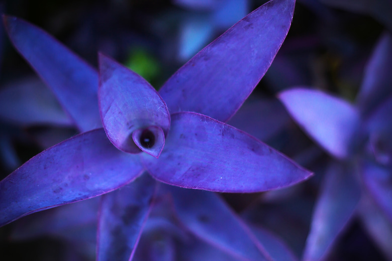 Lush, purple, lance-shaped leaves make purple heart plants (Tradescantia pallida) an exceptionally ornamental houseplant. Plant this exotic beauty in a hanging basket to let the foliage droop gracefully over the container. Then, come summer, you'll see tiny pink three-petaled blossoms growing in the leaf axils. They offer a stunning contrast to the deep foliage that captures every eye. Only water when the soil is dry.