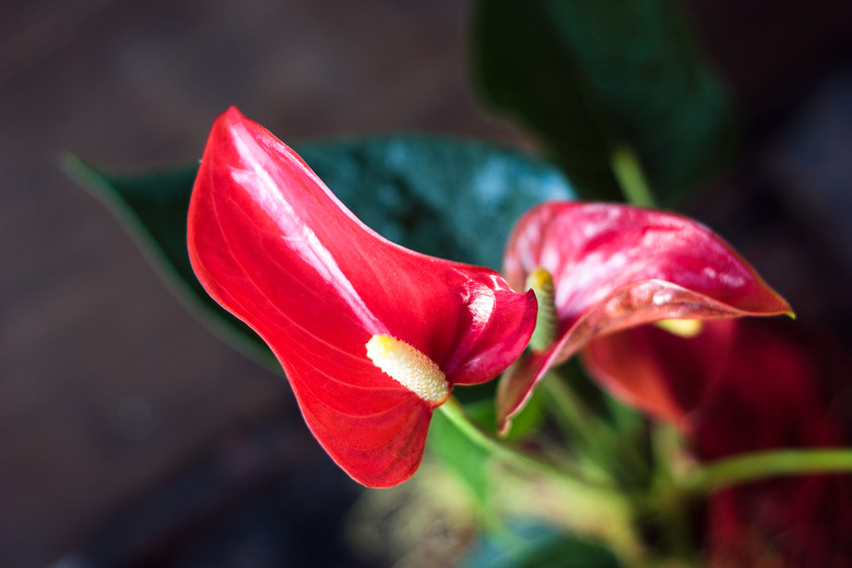 With brilliant red, waxy bracts plus spikes of spathe, flamingo flowers stand out in a crowd. They make exceptional houseplants. Also known by their scientific name Anthurium, flowering flamingos bear tiny flowers on the spathe that later develop into bright red berries. It's quite easy to keep the plants looking great. Just water occasionally and wipe dust off the lance-shaped bracts with a moist sponge.
