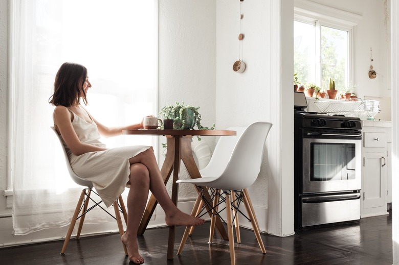 Katherine's studio consists of a single main room, yet each spot has a different purpose. A workstation acts as a home office, while a small round table and chairs becomes a dining nook.