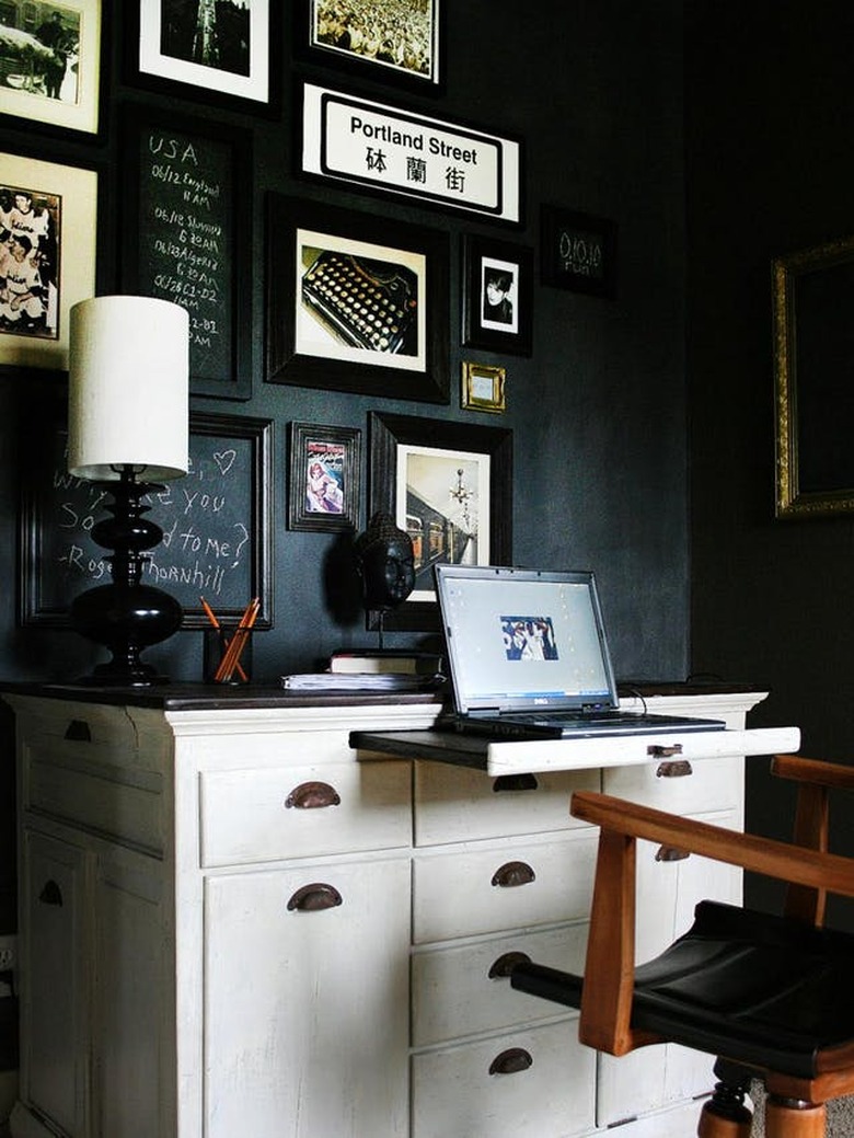 Talk about doing double duty. This classic dresser turned compact work space is a prime example of upcycling. And we love the way the white finish pops against the black walls.