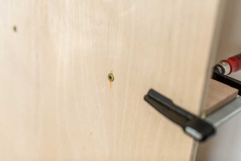 Lift the plywood board up off your work surface and gently lean it against a wall or solid surface with the back facing out toward you. Using the pre-drilled holes you made in the plywood in Step 2 as a guide, drill through the holes again using the same power drill and bit. You'll be drilling through to the shelves. Sink wood screws through the pre-drilled holes from behind, and remove the clamps.