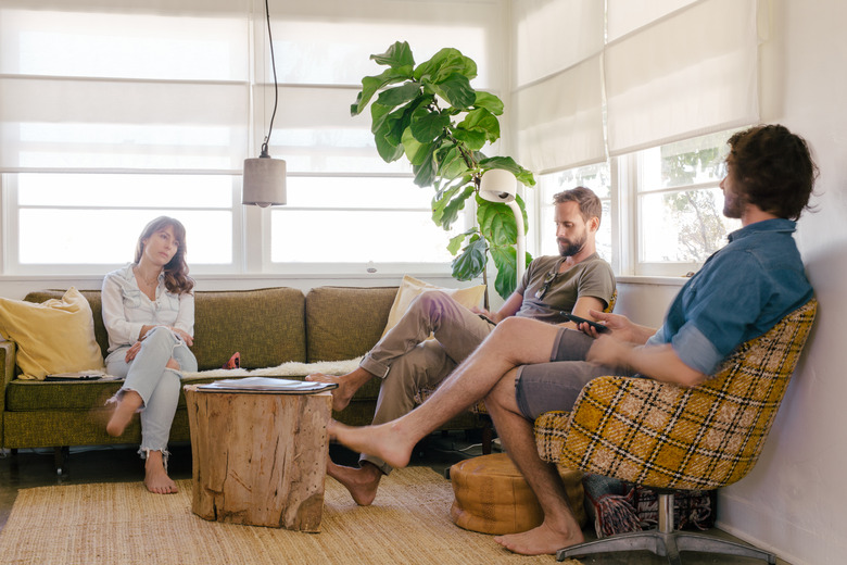 August, Bennett and Uhlhorn convene in the living room, which features a sofa and chairs sourced locally, and a robust fiddle-leaf fig.