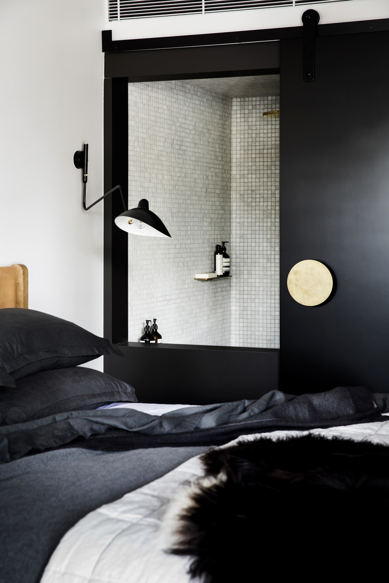 The architects used brass accents like a kitchen counter and oversized door handles to offset the black surfaces.
