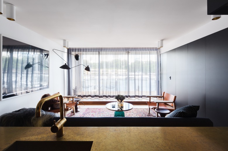 The open living room flows into the balcony and kitchen. A Serge Mouille Lampadaire floor lamp adds a sculptural touch to the space and complements the black wall paneling and artwork by Mike Stacey.