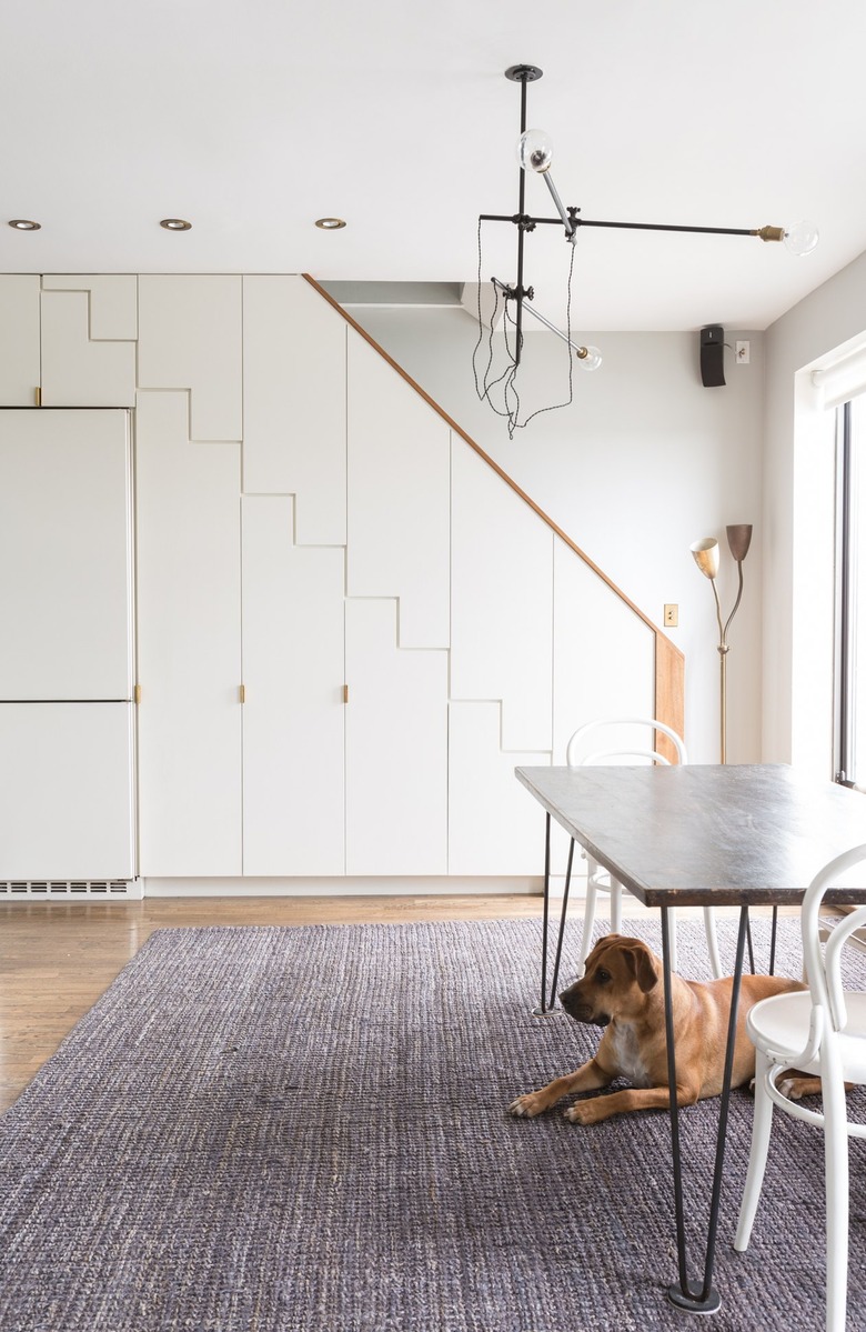 The apartment's unsightly staircase was transformed into a beautiful passage with a clever storage space built-in underneath. "It just gives it all these vertical lines, so it makes the apartment feel a lot bigger than it is," explains Vohra.
