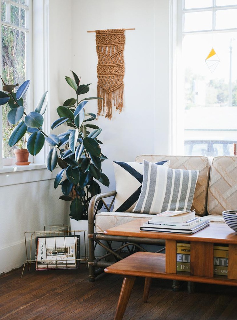 If you want more of a tree-like look, a rubber plant is your best bet. The easiest tree for beginners to maintain, this handsome plant grows well in bright, indirect light and doesn't require very much maintenance. House Plants Expert suggests that during the summer it needs to be kept moist by misting or wiping the leaves down with a damp cloth. But otherwise, it only needs to be watered once or twice a month. Rubber plants grow quickly, so be sure to plant yours in an oversize pot to avoid having to replant it. Or, if you prefer to keep it small, you can restrict its growth by opting for a smaller pot. And don't forget to fertilize every two weeks during late spring to early fall.