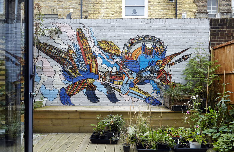 A mural that Toong spotted in Shoreditch — London's equivalent to Williamsburg, Brooklyn — inspired the choice to add an instillation to the back wall of the patio. The couple hired Bristol-based artist Andy Council to create the one-of-a-kind piece.