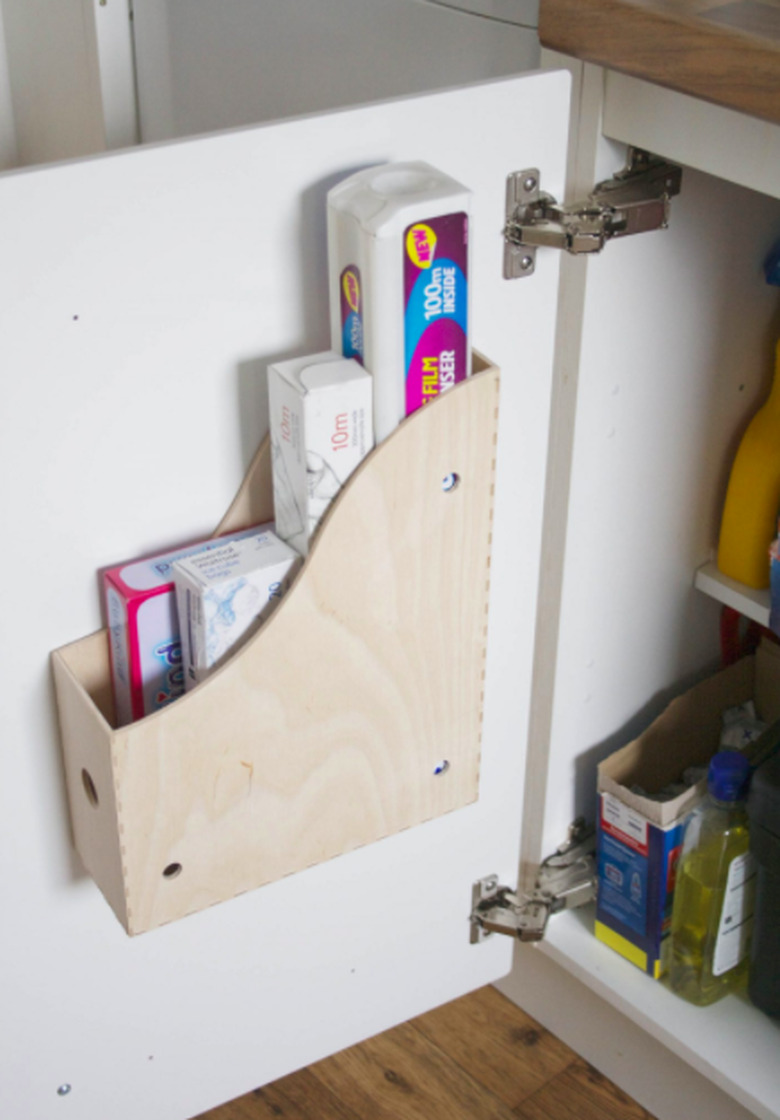 Keep essentials handy — like plastic bags, tin foil, Saran wrap and more — by storing them in an Ikea magazine holder ( $9.99 ) that's attached to the inside of your cabinet door. Use removable Command strips to avoid damaging your cabinets with nails or screws.