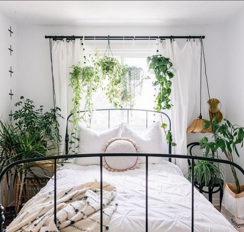 Free up a little space on top of your cabinets, shelves, tabletops, and even the floor by hanging your foliage instead. Wendy from The KWendy Home suspended a few trailing greens from the drapery rod in her bedroom, resulting in a verdant plant curtain.
