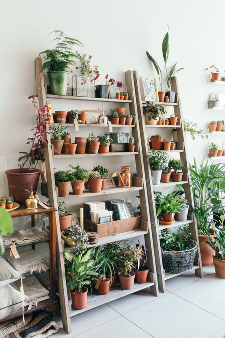 Now that temperatures are on the rise you can begin to put the blankets away and use your leaning ladders for a garden instead. Stack those wooden beauties sky-high with all of your favorite greenery. And if you don't already own a leaning bookcase, check thrift stores for rustic, inexpensive versions, or buy one that's brand new.