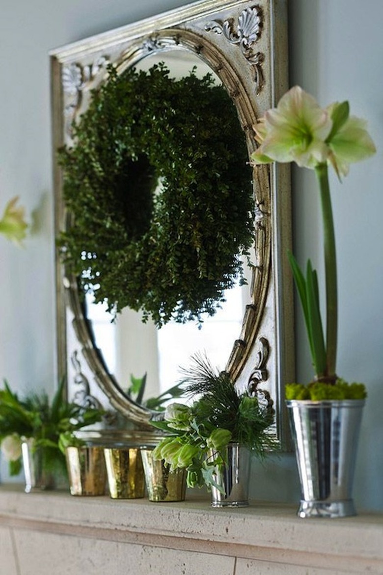 A fresh evergreen wreath isn't only for the front door of your home. Consider hanging a wreath on top of a large mirror either in your foyer or over a fireplace mantel for an extra touch of Christmas greenery. However, don't feel limited to traditional evergreens — it's possible that other materials might mix better with your home decor. For example, consider a wreath of dried magnolia leaves, pine cones, vintage glass ornaments, feathers, sea shells, felted wool, or fresh flowers. Whatever material you choose, the wreath should fit inside the frame of your mirror.