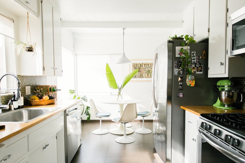 The breakfast area features vintage chairs and an Ikea table — a classic high-low mix.