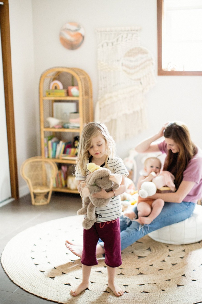 The nursery, with its muted, natural tones and textures is filled with wicker and macrame accessories.