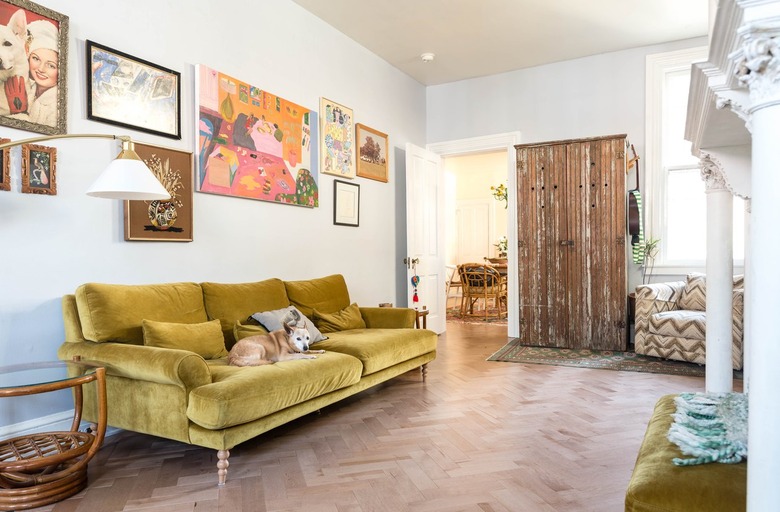 The velvet sofa, from Interior Define — a company that allows you to customize your couch — is one of the few pieces of furniture in the home that isn't thrifted.