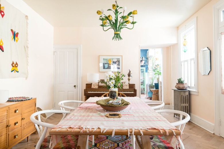 The art, chandelier, and textiles reflect Freibaum's "psychedelic grandma" aesthetic.