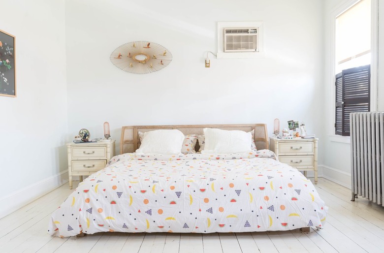 Upstairs, the master bedroom is what Freibaum calls luxurious. There's no television or dressers. They painted the floor white when they moved in, having ripped out the pre-existing carpet. The sheets are Dusen Dusen.