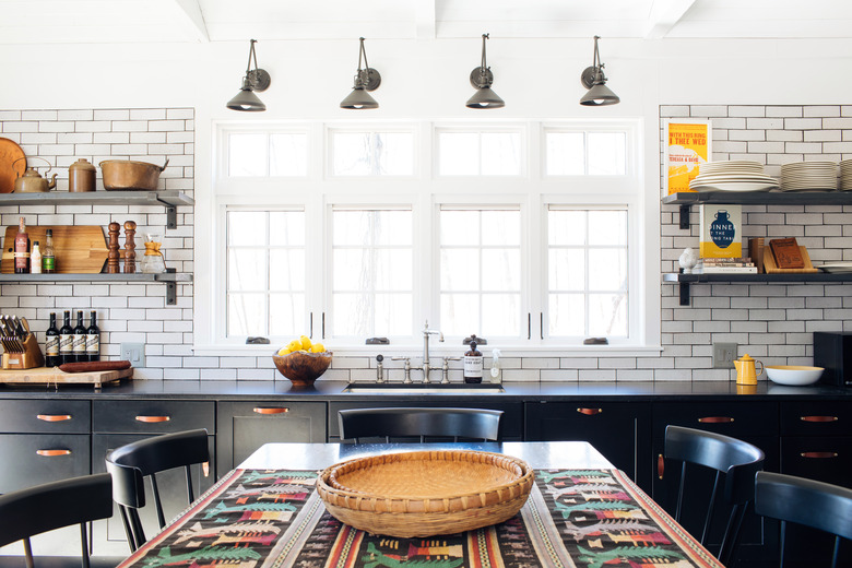 The kitchen in the new Hill House is outfitted with Fireclay tile, Kohler fixtures, and custom-designed decor from Milwaukee's La Lune Collection, plus Rejuvenation lighting.