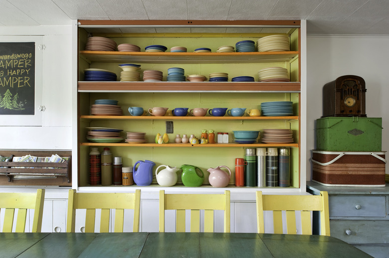 Cheery and bright, the breakfast room features sunny yellow chairs, a stack of colorful vintage lunch boxes atop an old dresser, and open shelving flaunting plates and other dinnerware in midcentury hues like rose and aqua.
