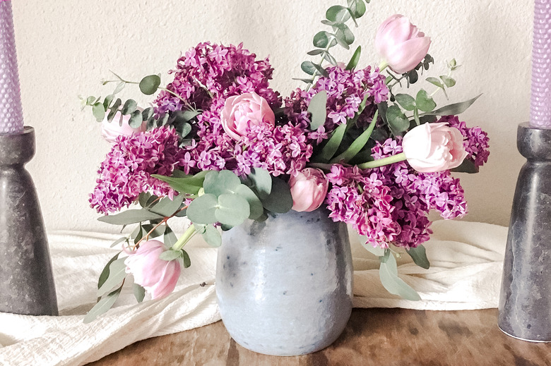 TIP: For this DIY, we chose two kinds of flowers, lilacs and tulips, and one kind of greenery, a mixed eucalyptus bundle. Have fun and play with different textures! I chose the tulips for their movement, lilacs for their texture and fragrance, and the eucalyptus because it's silvery tones play nicely with the cool purple shades of the lilacs and tulips.