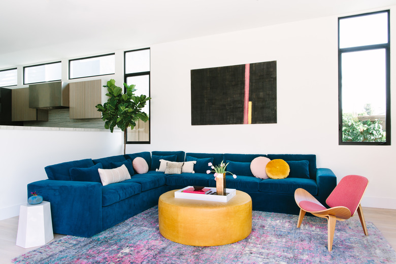 "Pops of color was such a perfect way to introduce warmth and interest while also being kid-friendly and modern," Murphy said. On the custom-designed sofa, the bright blue fabric is accentuated by round pillows that echo the other hues in the room.