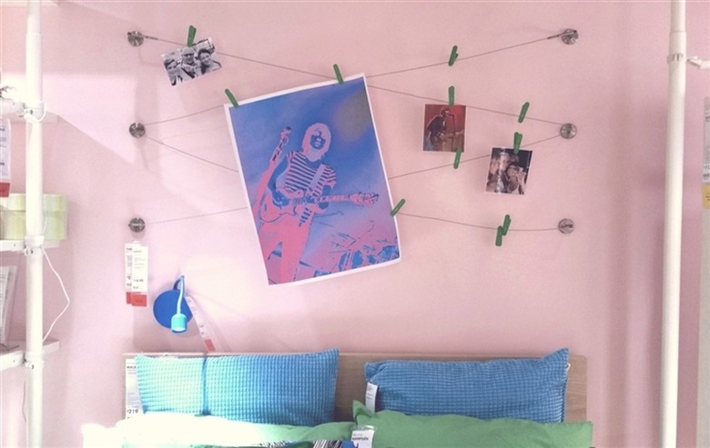 Show off your favorite pictures with this Ikea-approved dorm room hack. Pick up a couple of the hard-to-pronounce Dignitet curtain wires ( $14.99 ) and criss-cross them on the wall behind your bed. Use colorful clothes pins to keep your artwork on display.