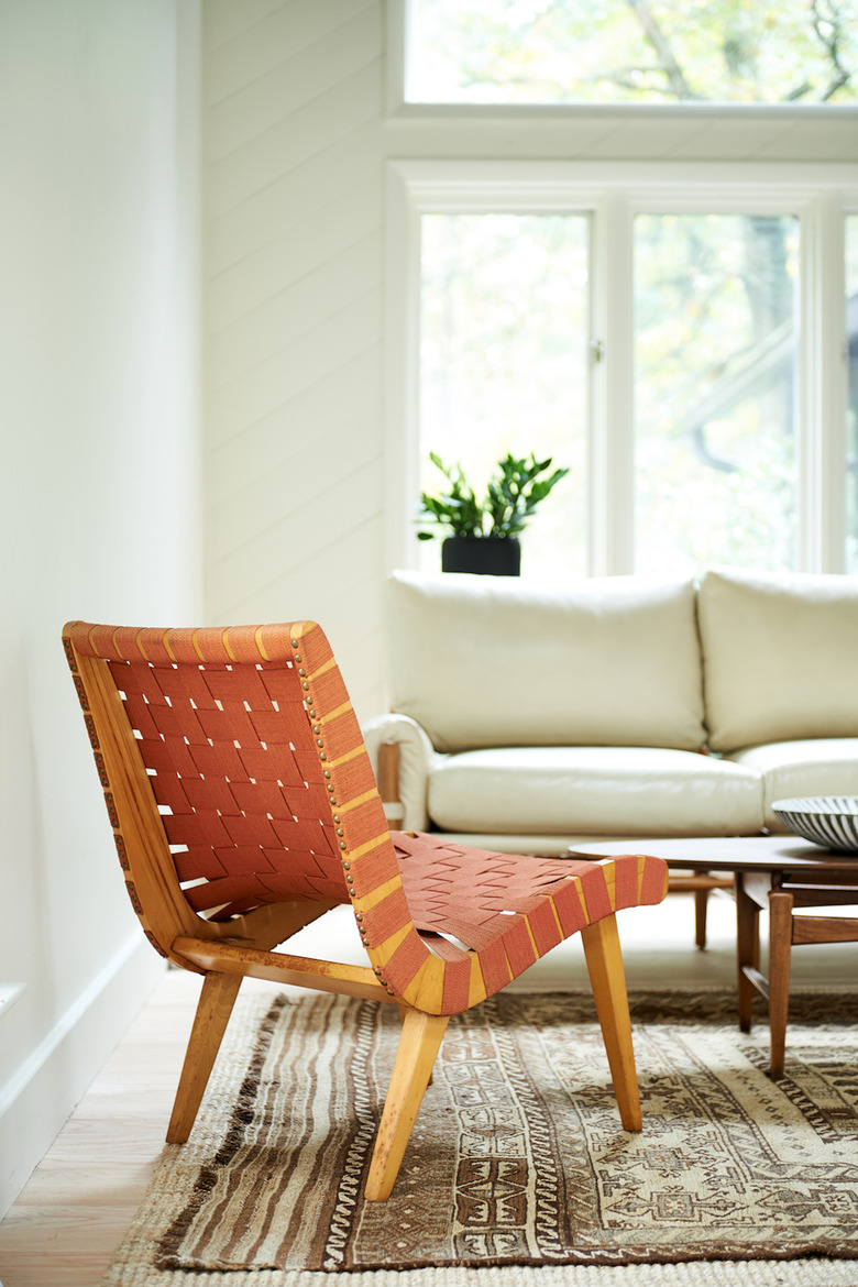 White walls matched with a white sofa reflect the natural light flowing through the windows. A natural-toned rug from Weisshouse and woven vintage Pierre Jeanneret chairs furnish the living room.