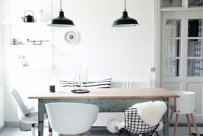 Sleek black metal chairs or ceiling lamps, or a repurposed metal table, are all ways to add industrial elements to your rustic Scandi dining space.