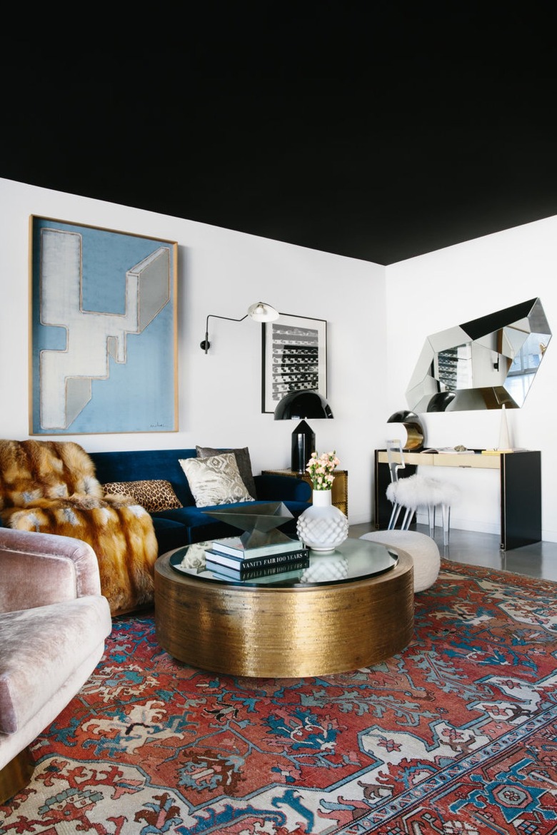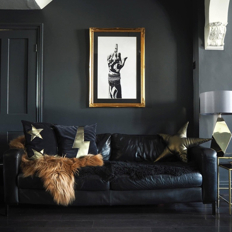 If covering your living room from floor to ceiling in black is giving you anxiety, focus your efforts on the furniture and decor instead. Got a white sofa? Add a black throw or a few accent pillows. Need a new floor lamp? Look for a fixture with a black finish. In this eye-catching setup, the sofa frame, throw blanket, light fixture, side table, area rug, and artwork make quite the statement.